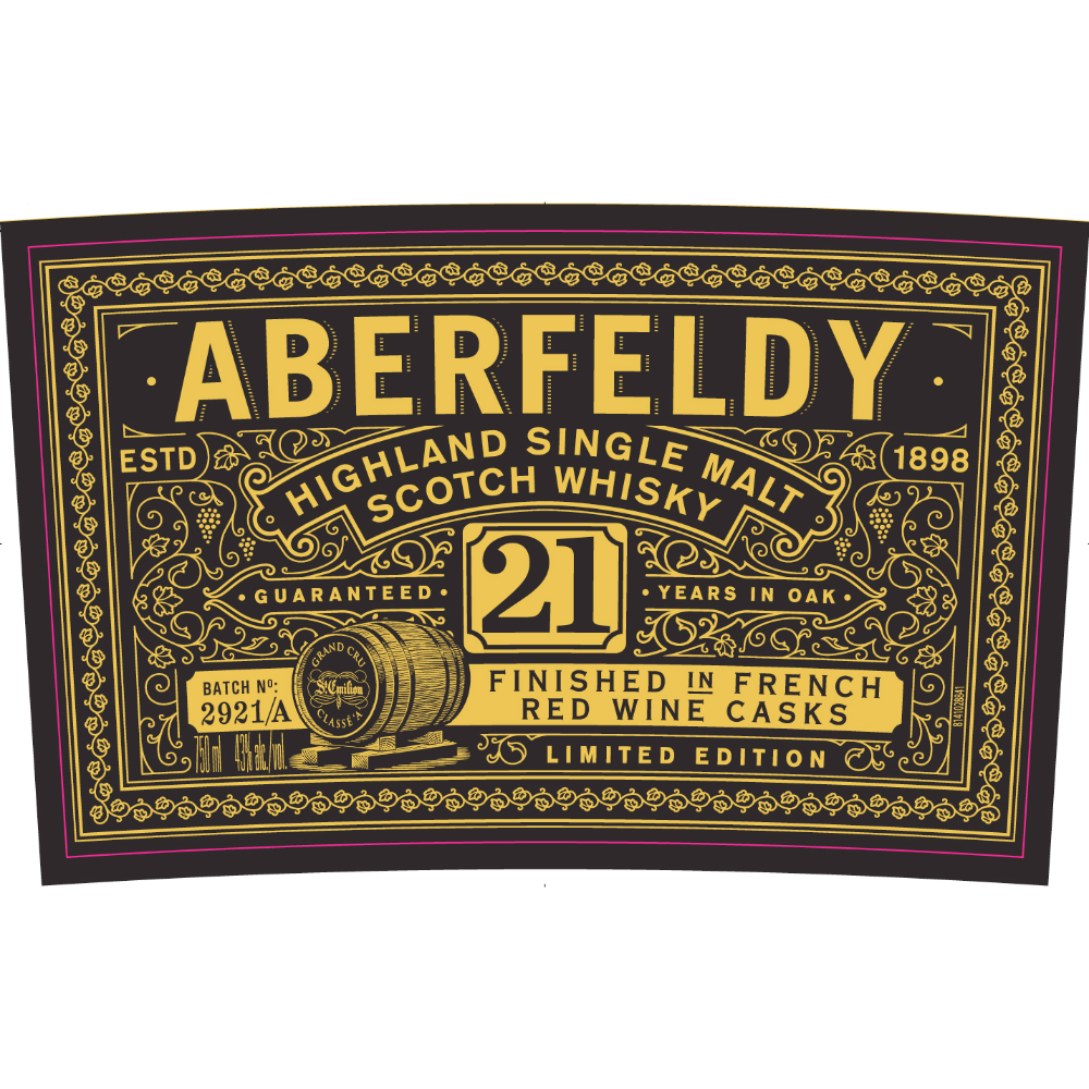 This Limited Edition Aberfeldy Highland Single Malt Scotch Whisky has been aged for 21 years in oak and finished in French red wine casks before being bottled at 43% Alc/Vol.