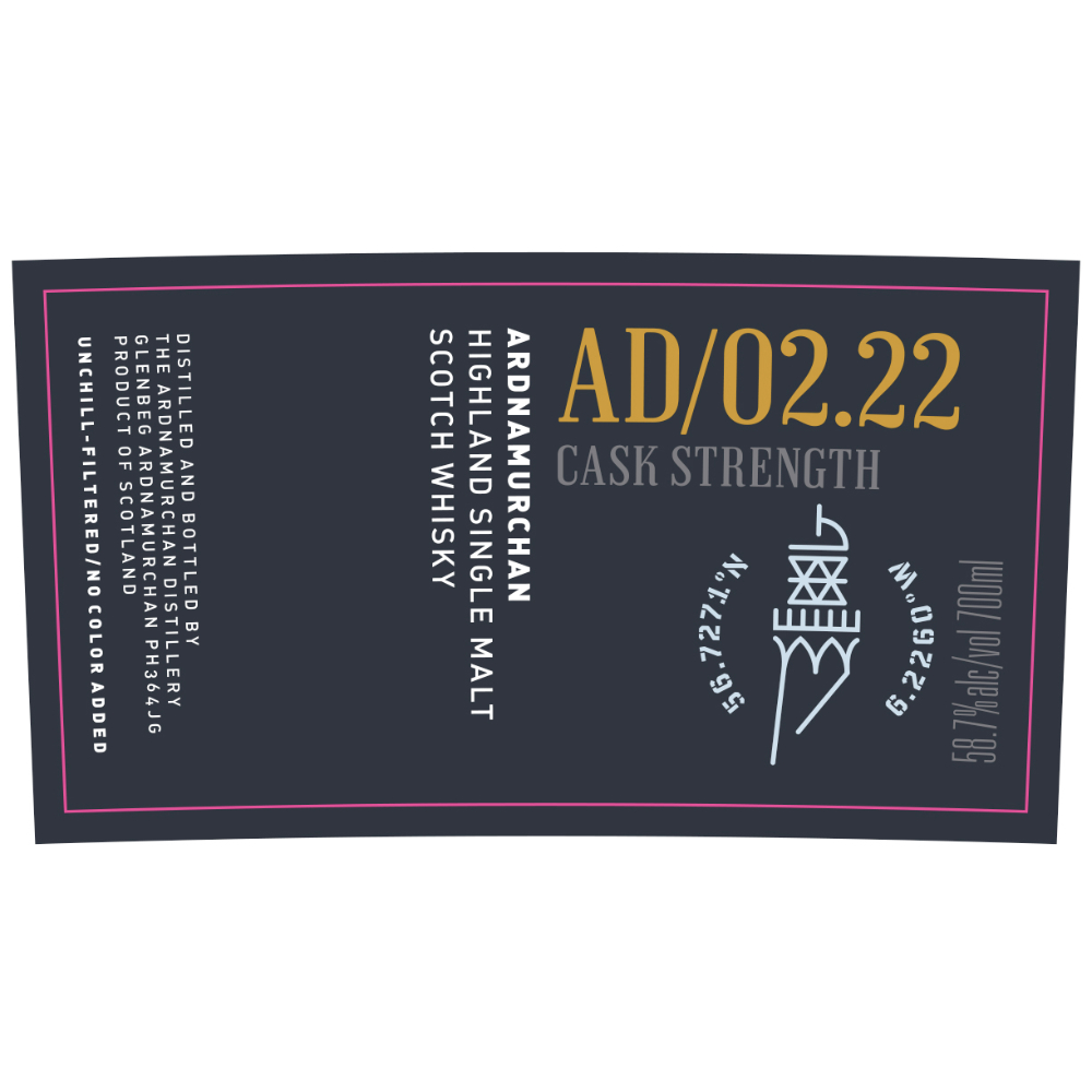 Ardnamurchan AD/02.22 High Single Malt Scotch Whisky is distilled and bottled by The Ardnamurchan Distillery. Bottled at cask strength. Product of Scotland.