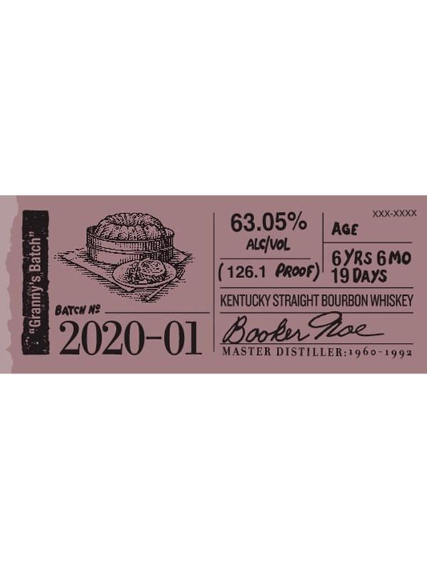 Booker’s “Granny’s Batch” Batch 2020-01 is aged for 6 years, 6 months, and 19 days and bottled at 126.1 Proof.