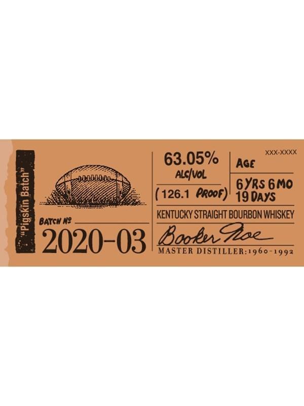 Booker’s “Pigskin Batch” Batch 2020-03 is aged for 6 years, 6 months, and 19 days and bottled at 126.1 Proof.