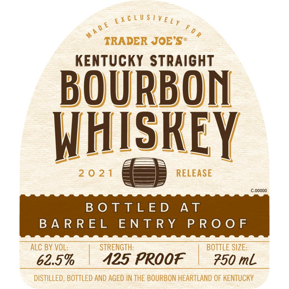 Trader Joe’s Bourbon Barrel Entry Proof Kentucky Straight Bourbon Whiskey has been made exclusively for Trader Joe’s. This 2021 release has been distilled, bottled, and aged in the bourbon heartland of Kentucky and bottled at 125 proof.