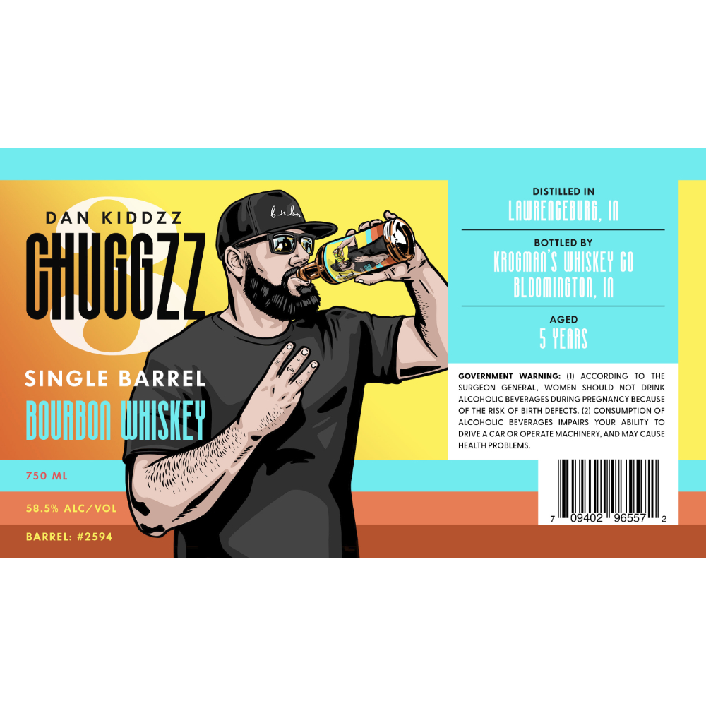 Dan Kiddzz Chuggzz Single Barrel Bourbon Whiskey is aged for 5 years before being bottled at 58.5% ALC/VOL. Distilled in Lawrenceburg, In. Bottled by Krogman’s Whiskey Co.