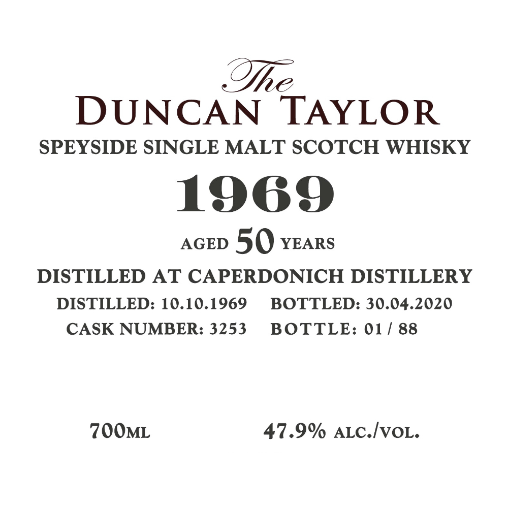 The Duncan Taylor Speyside Single Malt Scotch Whisky 1969 was distilled at Caperdonich Distillery and aged 50 years. 47.9% ALC/VOL.