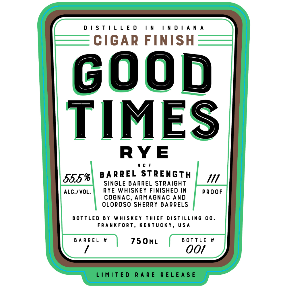 Good Times Cigar Finish Rye is a barrel strength straight rye whiskey finished in cognac, armagnac and Oloroso Sherry barrels. Bottled at 111 proof by Whiskey Thief Distilling Co. Limited rare release.