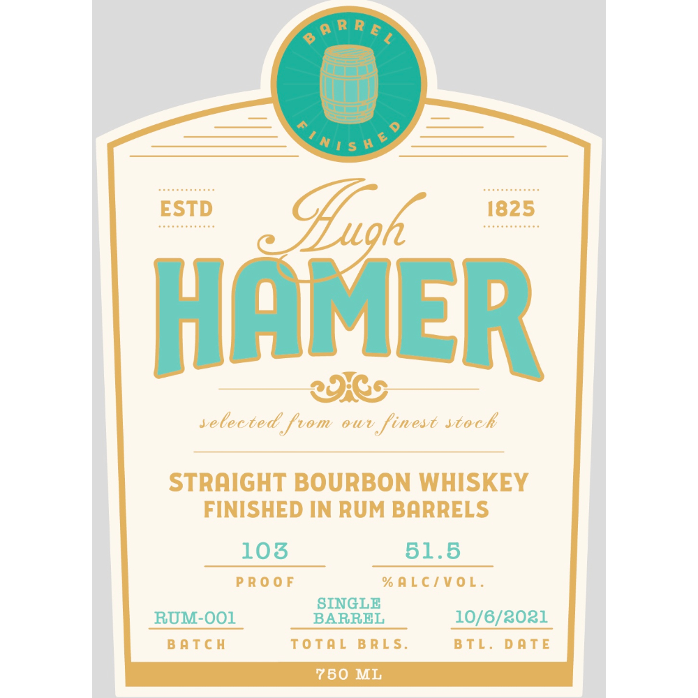 Hugh Hamer Straight Bourbon Whiskey is finished in rum barrels and bottled at 103 proof. This single barrel bourbon is selected from the finest stock.