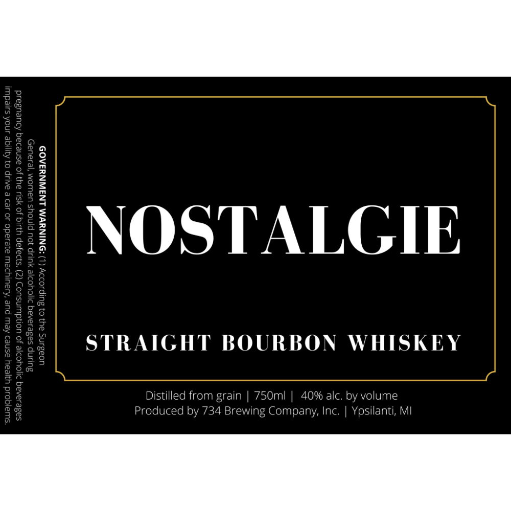 Nostalgie Straight Bourbon Whiskey is produced by 734 Brewing Company. Bottled at 40% Alc. by volume.