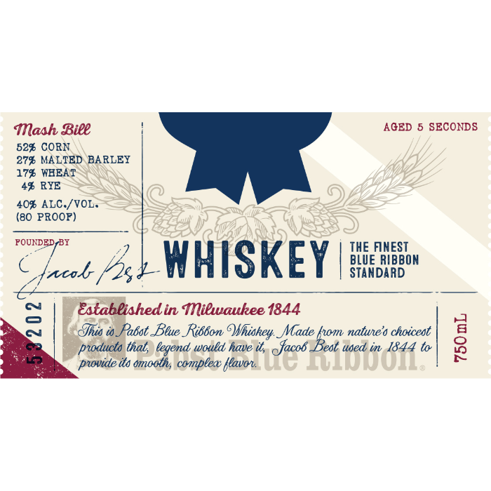 This is Pabst Blue Ribbon Whiskey. Made from nature’s choicest products that, legend would have it, Jacob Best used in 1844 to provide smooth complex flavor. Only the finest ingredients have been carefully mashed, fermented and distilled to create our most unique spirit.