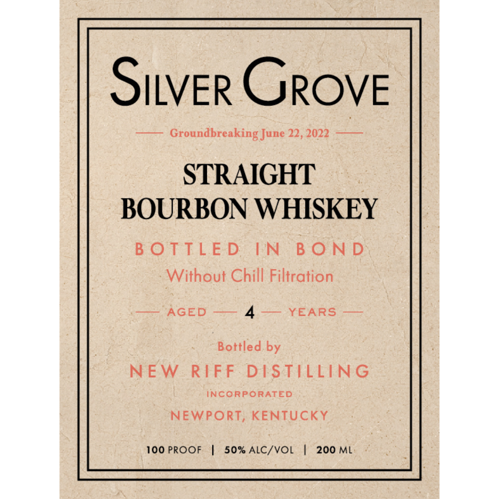 Inspired by a 1933-vintage bottling of “Silver Grove” Bourbon (a whiskey distilled before prohibition in Cincinnati, Ohio). Entirely distilled and aged in Newport by New Riff Distilling, and Bottled in Bond to commemorate the June 22, 2022 groundbreaking of our Silver Grove, KY warehouse campus. Aged for 4 years.