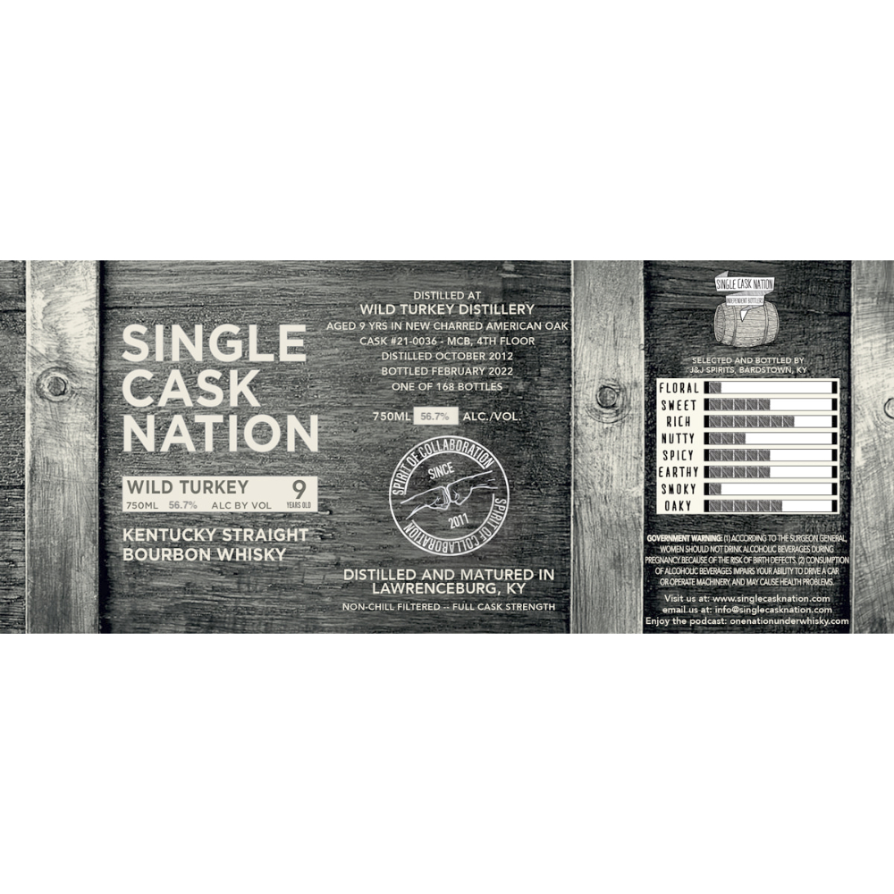 Single Cask Nation Wild Turkey 9 Year Old Bourbon was distilled at Wild Turkey Distillery October 2012. Bottled February 2022. Aged 9 years in new charred American oak.