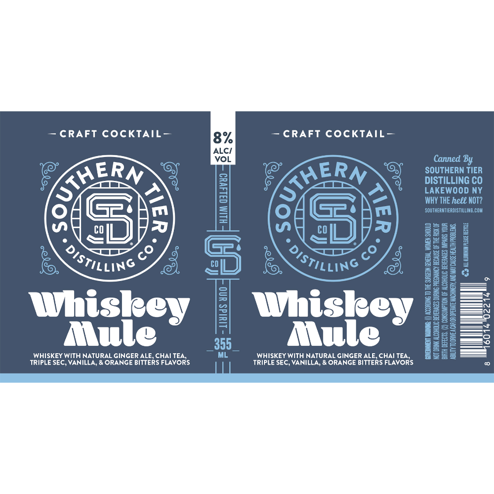 Southern Tier Distilling Whiskey Mule is a Canned Cocktail made with whiskey, natural flavors, ginger ale, chai tea, triple sec, vanilla, and orange bitters flavors. 8% ALC/VOL. 355mL Cans.