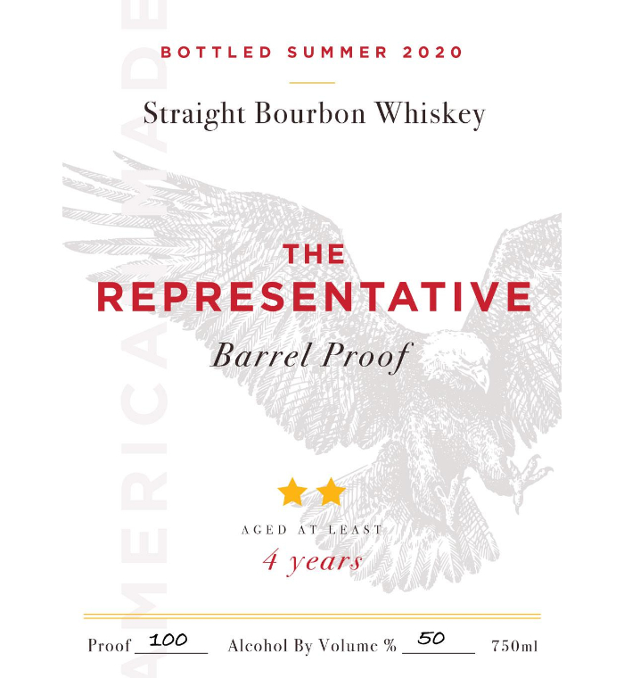 The Representative is straight bourbon whiskey proudly made in the USA and aged for a minimum of 4 years in new charred oak barrels and bottled by Proof & Wood Ventures in Bardstown Kentucku.