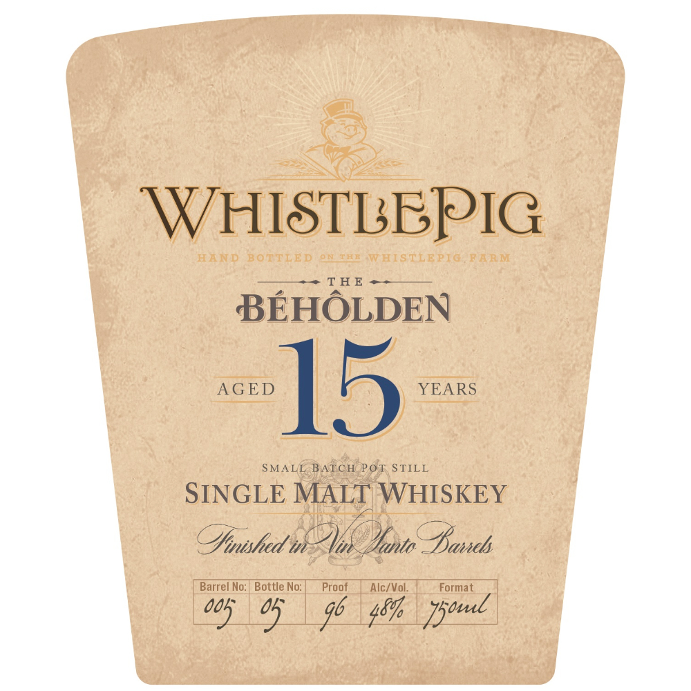 WhistlePig The Beholden has been aged for 15 years and finished in Vin Santo Barrels. Hand bottled on the WhistlePig Farm at 96 Proof. Small batch pot still single malt scotch.