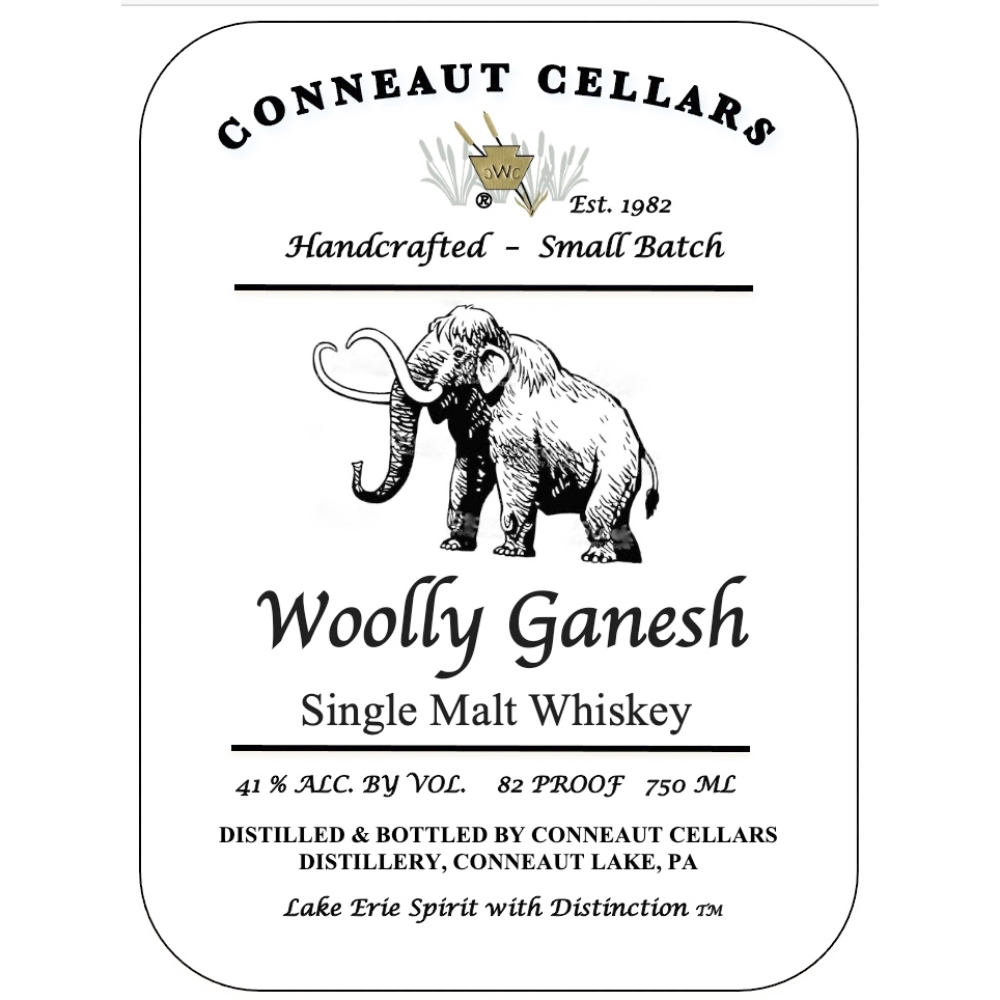 Conneaut Cellars Woolly Ganesh Single Malt Whiskey is bottled by Conneaut Cellars Distillery, Conneaut Lake, PA. Bottled at 41% ALC/VOL (82 Proof)